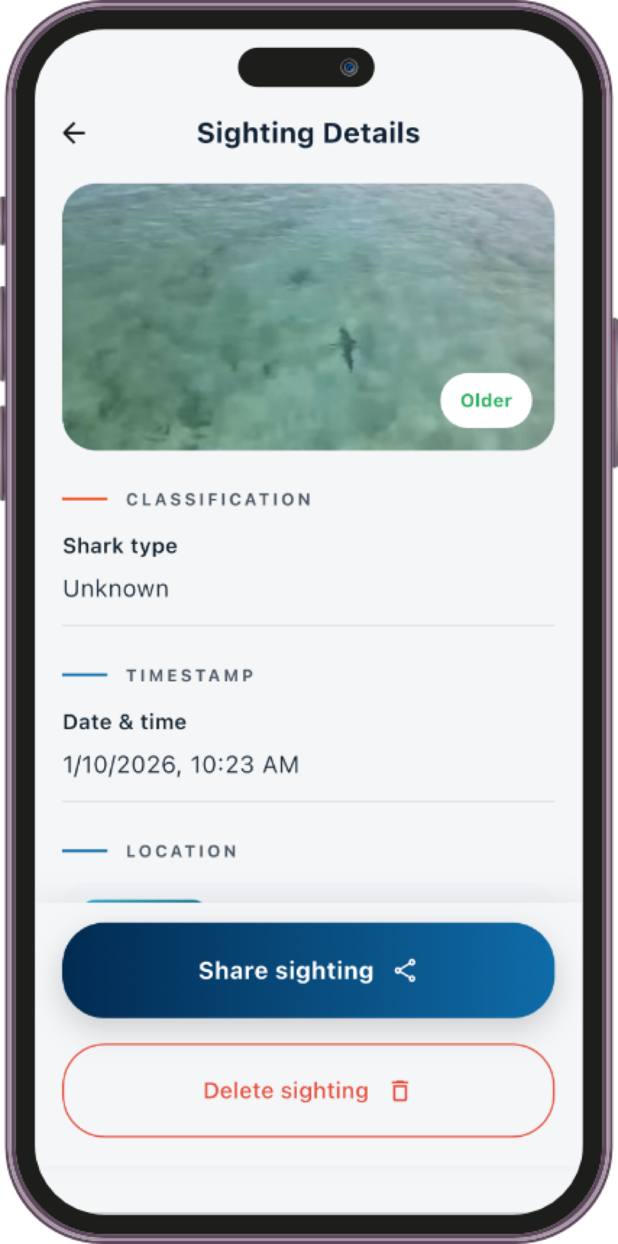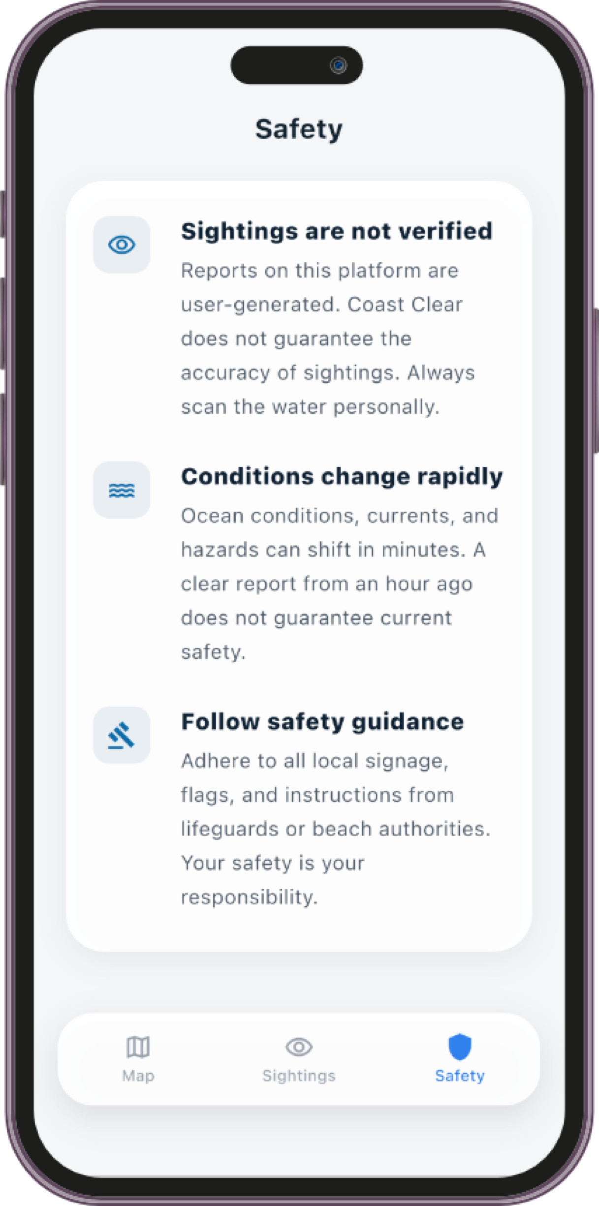 A mobile app that helps beachgoers stay informed about shark sightings and ocean safety. It combines a real-time map, community-reported data, and filters to quickly assess risk by location and recency. The design prioritizes clarity, speed, and situational awareness.