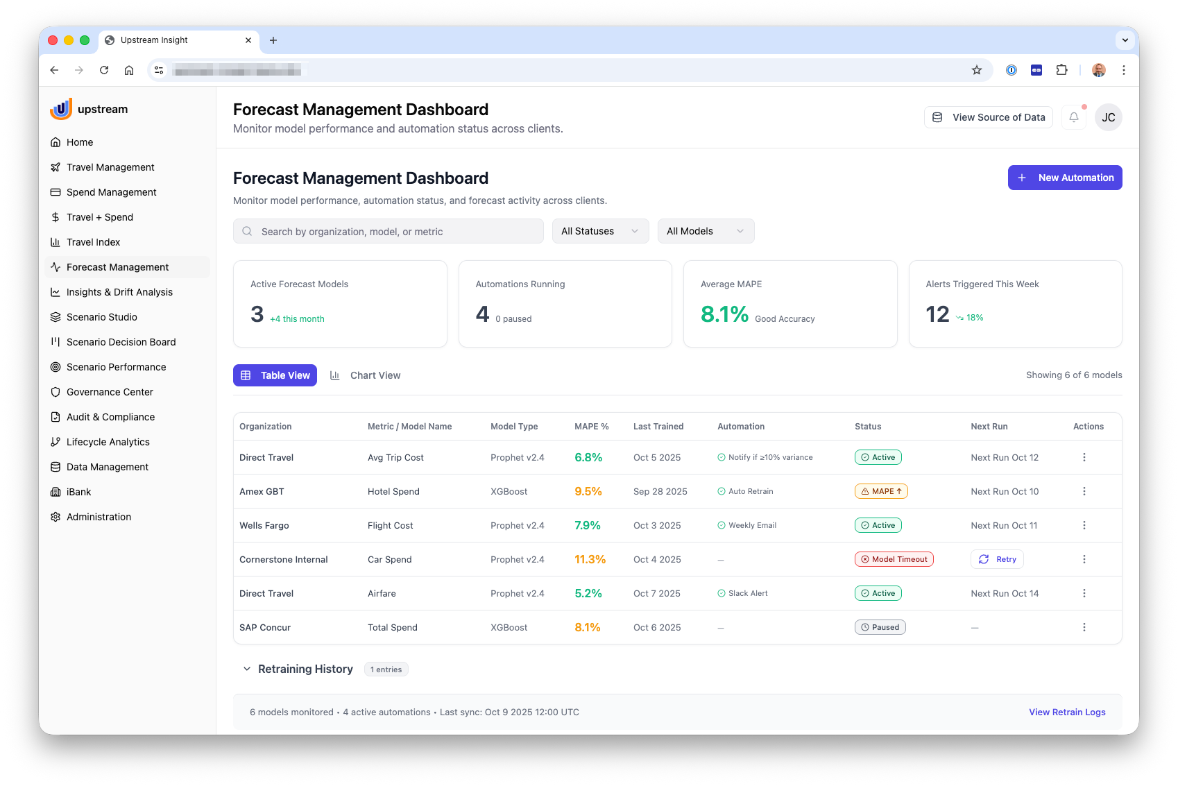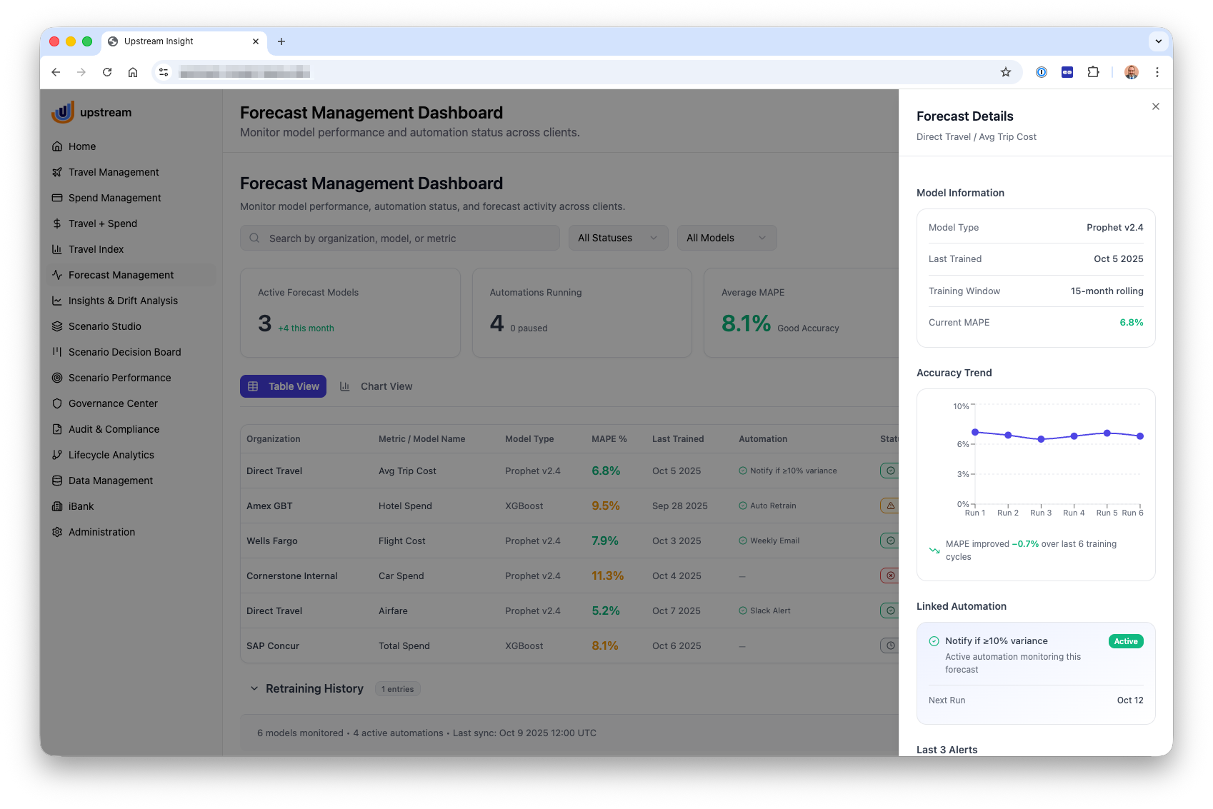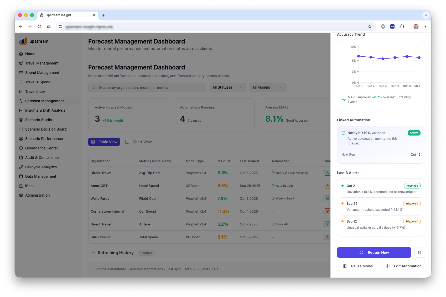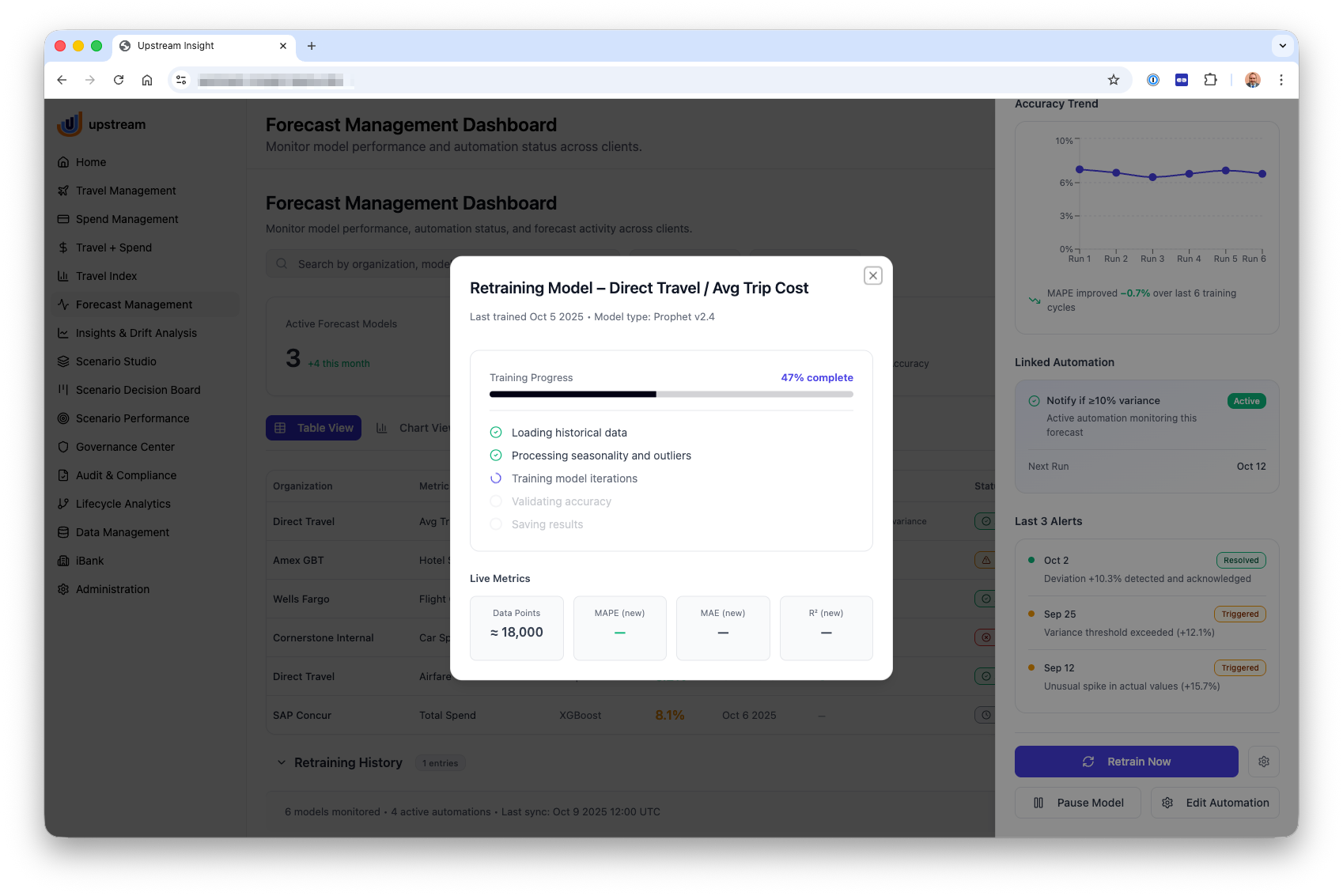 A UI/UX design project focused on enabling corporate travel managers to monitor forecast performance, manage predictive models, and respond to cost variances with confidence. The interface combines dashboards, detailed forecast analysis, and model management tools to provide visibility into trends, accuracy, and automation. Users can explore scenario-driven forecasts, track model health over time, and take action through alerts, retraining, and automation controls. The design emphasizes clarity, transparency, and decision support by turning complex forecasting data into intuitive, actionable insights.